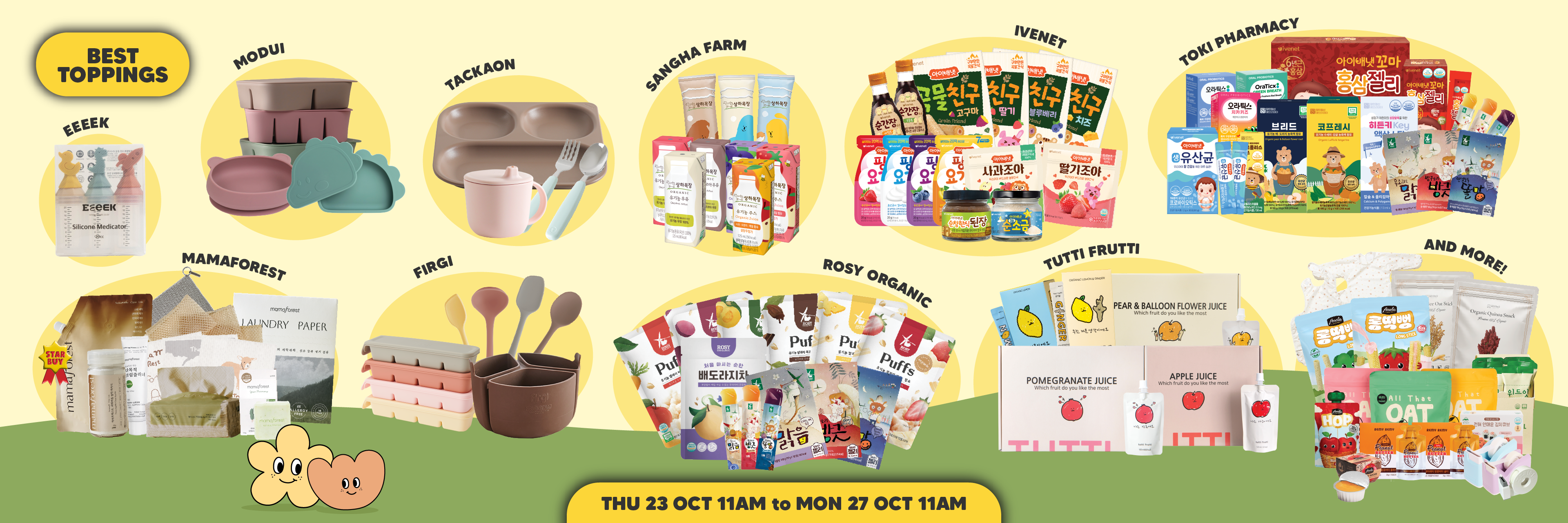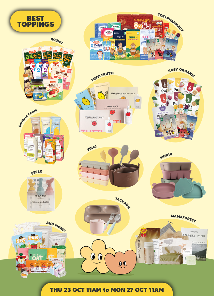 Ivenet, Jilmajae, Anela, Rosy Organic, Renovera, Eeeek, Mamaforest, Tutti Frutti, Attipas, Magnets, Stationaries, ATOPALM, Momsboard, Lineplus, Moskinto, Immunity Everyday, Non-Spicy Kimchi Cube, Sangha Farm, ToppingsKids