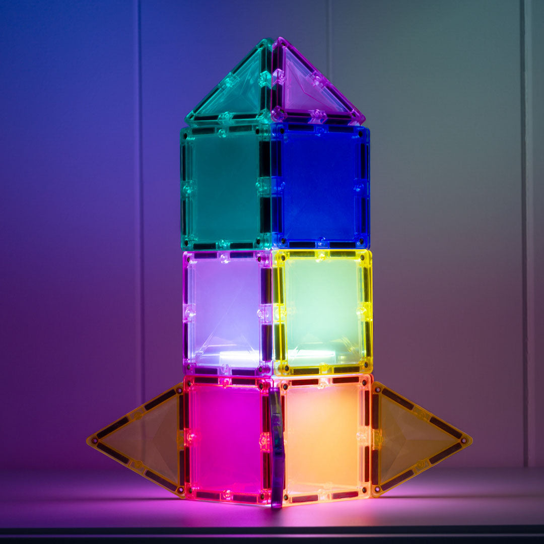 Discover the magic of open-ended STEAM play as you take colour and light exploration to a whole new level. Featuring pentagons, squares and equilateral triangles in all eight bright colours – plus a rechargeable light-up magnetic tile, this pack is designed to transform construction play into a wonder-filled lightshow!