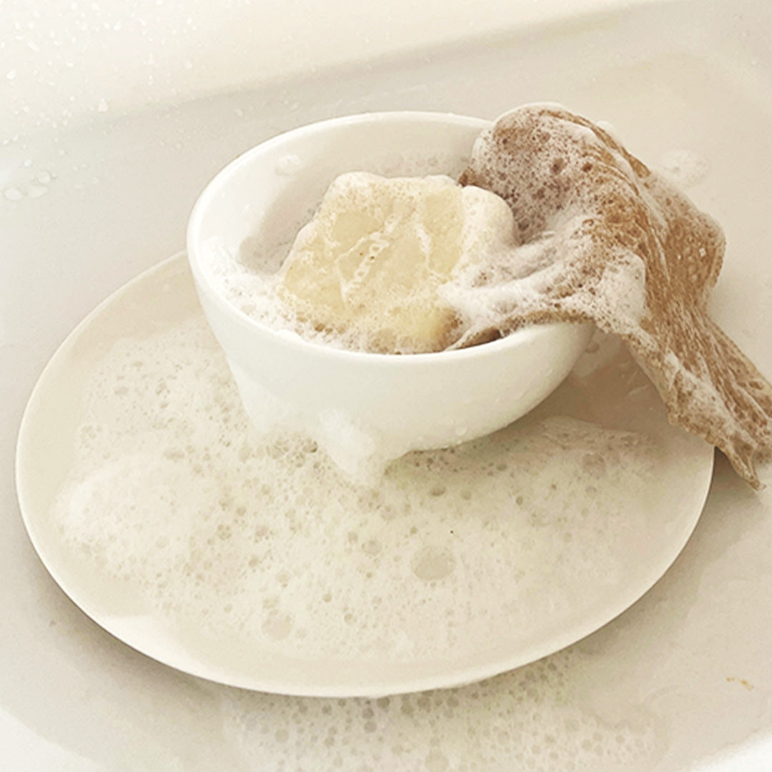 Doesn’t look like much on first impressions, but this lathers soap and cuts grease very well. Gentle on all surfaces - I use it for my SS pots and pans, donabe claypots, ceramic dishware and drinking glasses. Dries well, and easy to get stuck food bits out - which makes it hygienic. Also love that it’s biodegradable
