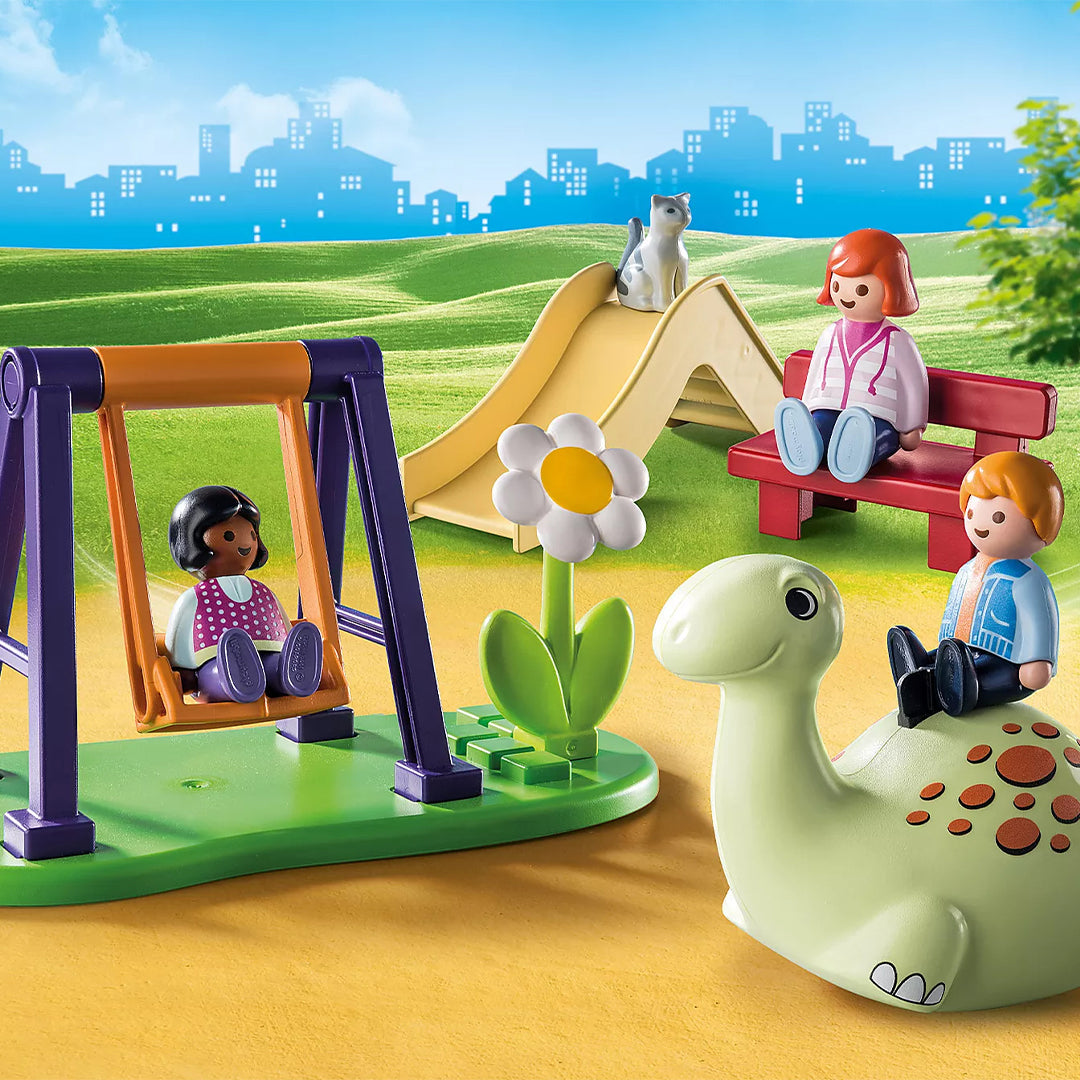 Accessories: 1 swing with grass surface and plug-in flower, 1 dinosaur seesaw, 1 slide, 1 bench
