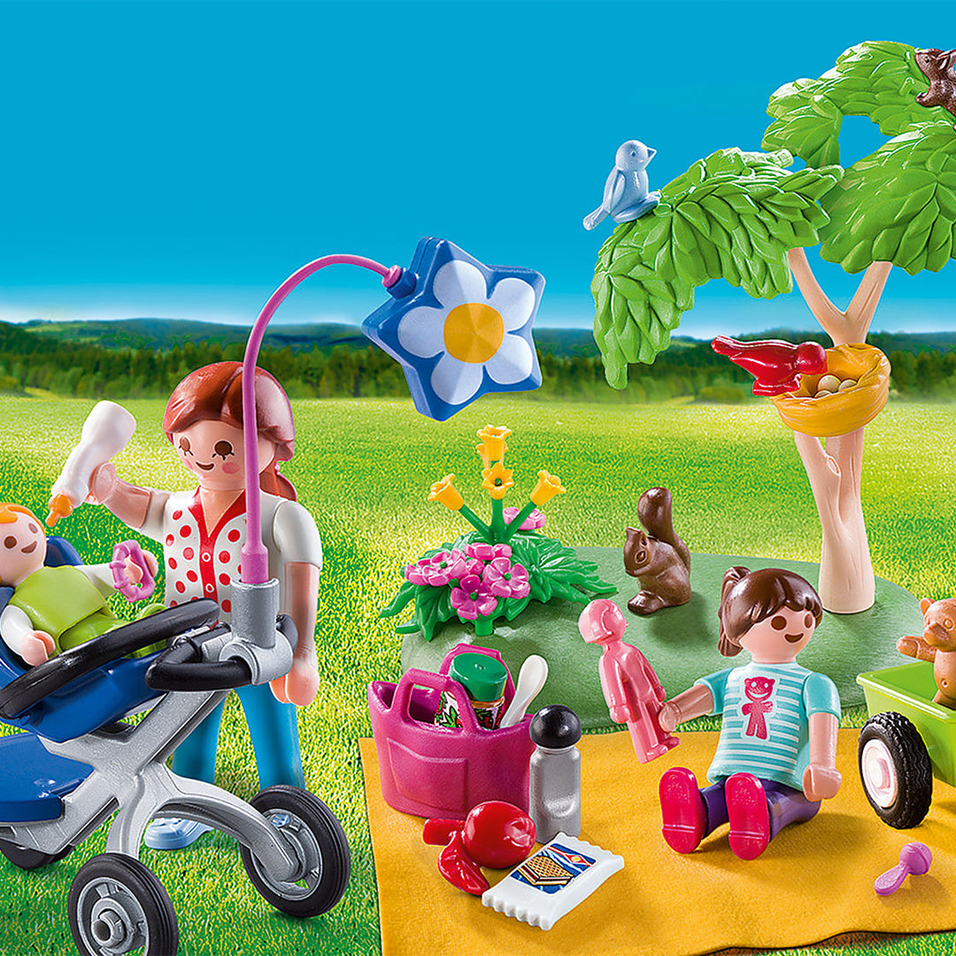 Accessories: 1 carry case, 1 stroller, 1 bottle, 1 baby toy, 1 tricycle with cart, 1 blanket, 1 meadow, 1 tree, 1 bird's nest, 3 flowers, 1 basket, 1 doll, 1 teddy bear, 1 water bottle, 1 spoon, 1 glass, 1 apple, 1 candy bar, 1 rattle